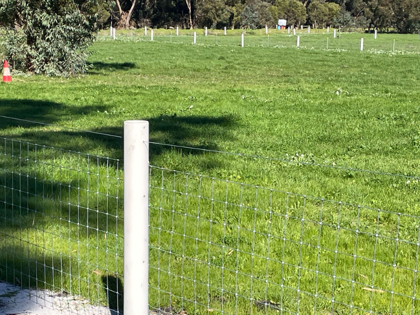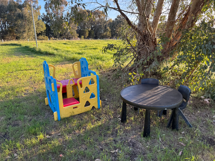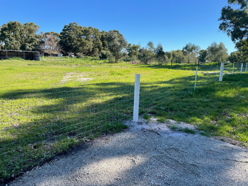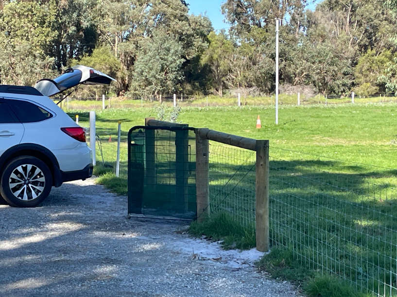 Fully fenced, gated paddock – A single, expansive pasture (6000sq m or 1.5 acre) surrounded by sturdy rural fencing. The ground is flat and open, providing plenty of room for running, play, training and scent work. Morning shade is abundant, though there are only a few trees in the actual paddock. There is a horse shelter in the far corner if it rains.