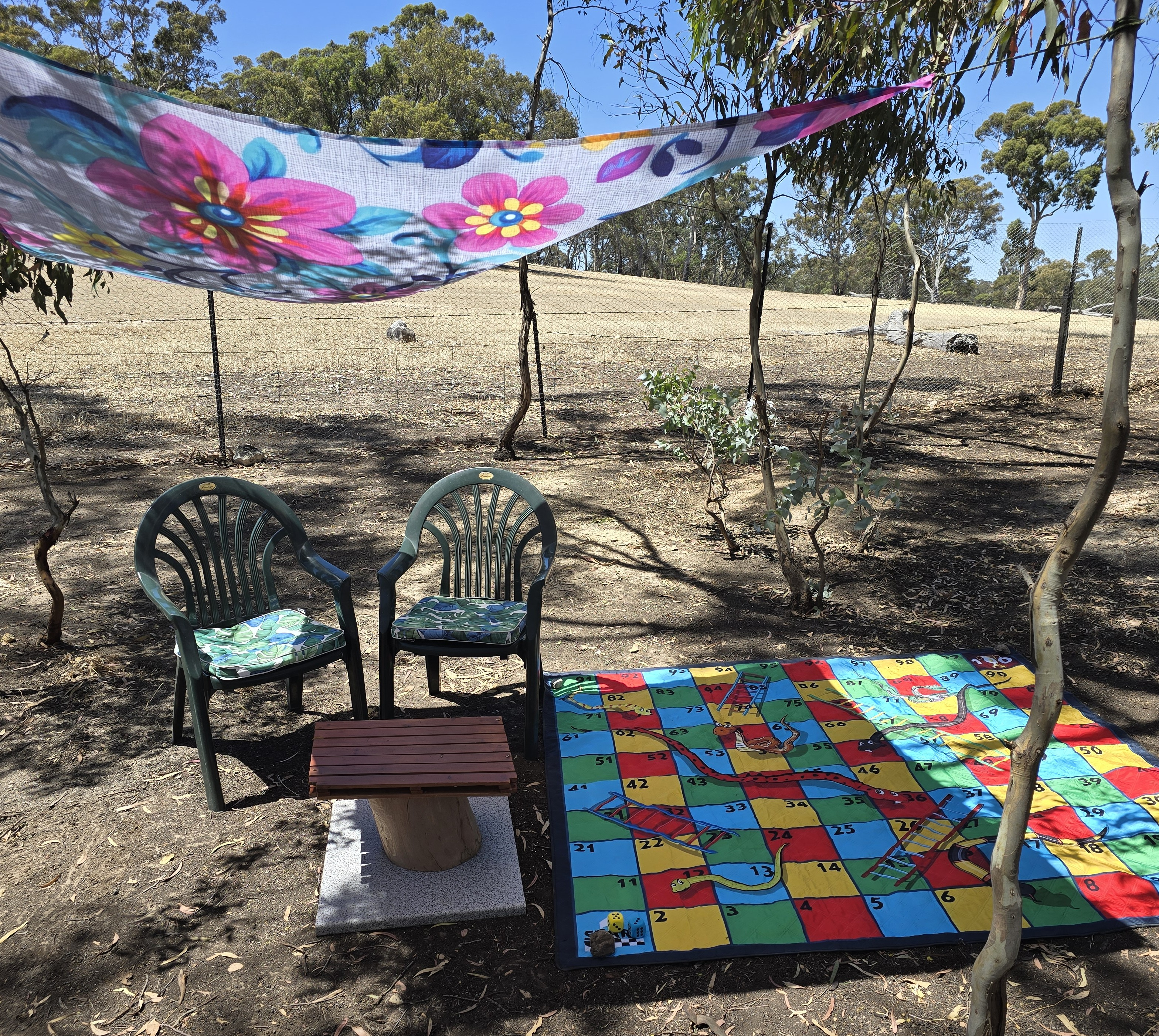 Activities are provided for children, including a huge snakes and ladders mat with large foam die. There is a small shelter area with two dog beds and a chair, and two small tables with chairs for a picnic or a rest under the gums.
